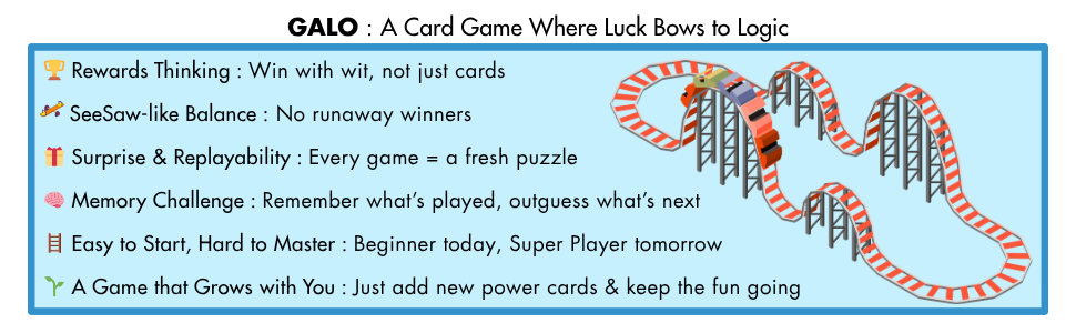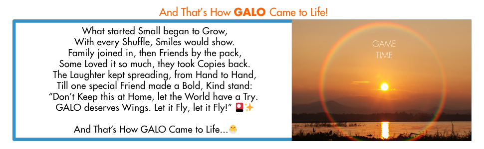 Galo is a quick, exciting strategy card game perfect for friends, family nights, and gifting. Boosts critical thinking while keeping the fun alive!
